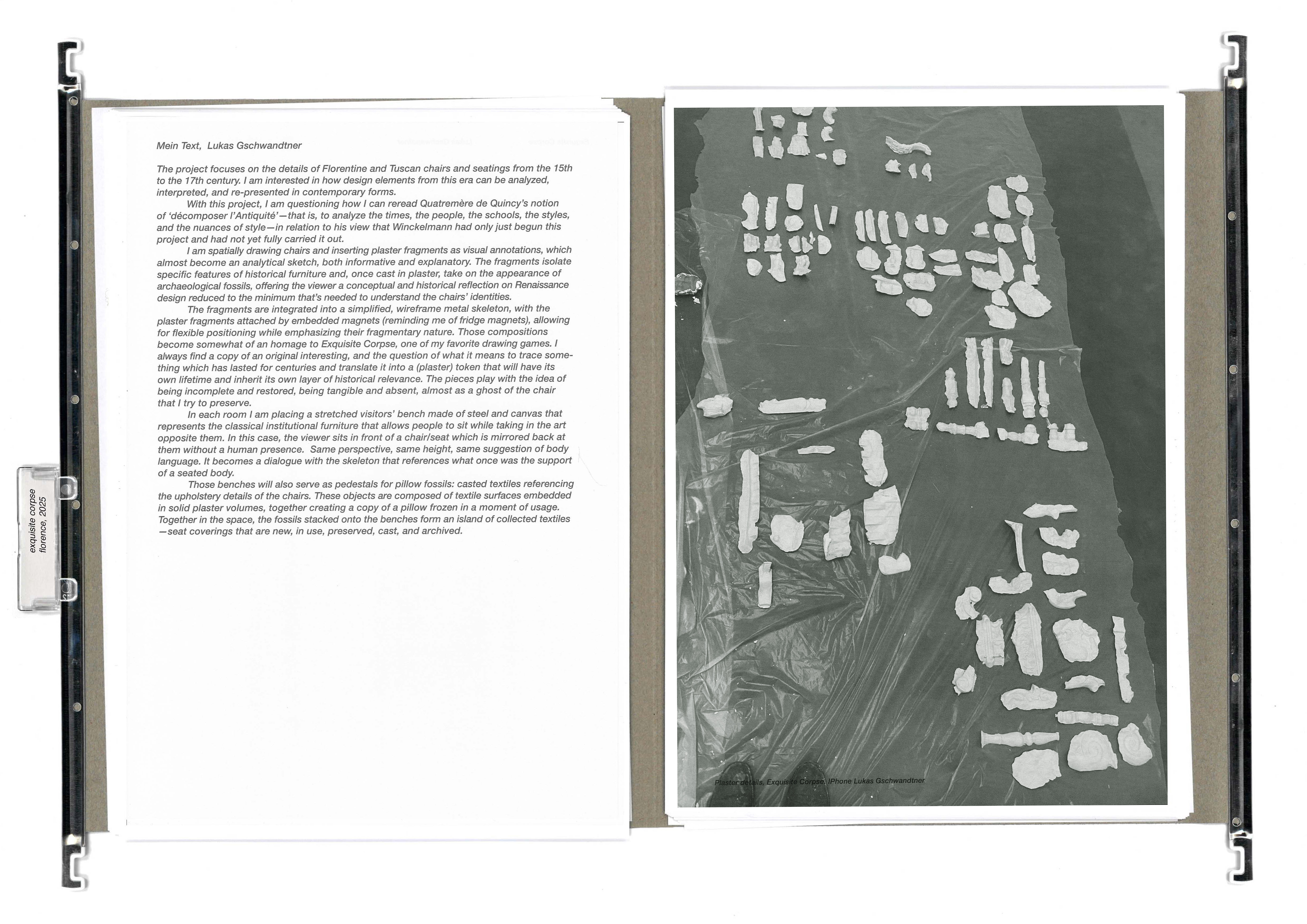exquisite corpse, florence, 2025 / freudian seatings for 50 minutes, a play written by deborah levy, zurich, 2025 / blind studies, basel, 2025, vienna, 2024 / pressed 18th and 19th century chair fragments, acne studios atelier, paris, 2024 / fossilized canvas fresco, family portrait of chairs, paris 2024, pressed 18th century armchair fragments, paris, 2024, a room of her own, mexico city, 2023, scenography for acne studios SS24 show presentation, paris 2023, lazy pillows, vienna 2023 / triclinium, invited by fendi, miami 2022 / fossilized tablecloths, vienna 2022 / lemaire, dover street market, beijing 2022 / theodora and retinue, basilica di san vitale, ravenna 2022 / pillow stuhl, vienna 2021 / pillow portraits, basel 2021 / solo show, pillow portraits, brussels 2021 / personalised caféstuhl, london 2020 / solo show, in verwendung, london 2020 / in verwendung newspaper, london 2020 / wiener maße, mexico 2019 / study of body and chair, london 2019 / melange chair, london 2019 / wiener maße, 2019/20 london / wiener handbuch, london 2018 / contact, gschwandtnerlukas@gmail.com